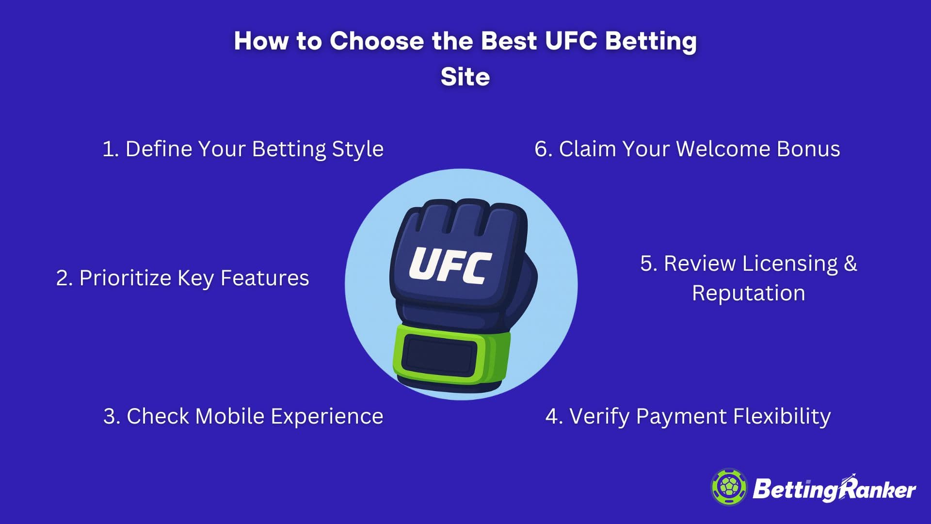 No existe un único sitio de apuestas de UFC que se adapte a todos. La mejor casa de apuestas deportivas para ti depende de cómo apuestas, qué características valoras y qué tan profundo quieres adentrarte en los mercados de UFC. Aquí tienes una guía rápida de 6 pasos para ayudarte a combinar tu estilo de apuestas con la plataforma adecuada, utilizando solo casas de apuestas deportivas de confianza presentadas en BettingRanker.